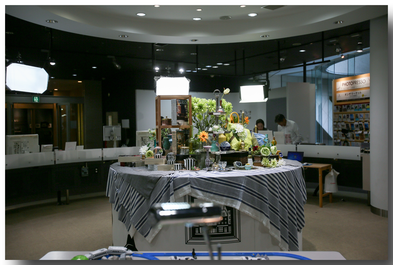 円形にレイアウトされた展示テーブルの前には、試写のための小物がレイアウトされている。