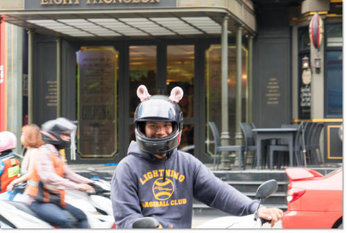 ドライバーがベストを着ていないので、バイクタクシーではなく、単なる二人乗り。