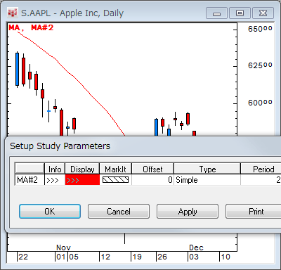 移動平均線(MA, MAx)は、"Basic Studies"に含まれています。 Categories of Studiesから "Basic Studies"あるいは"All"に切り替えて、Study Nameから"MA"を選択します。 キーボードから "ma" と入力すると ma を含むStudyやFunctionを表示します。 Studyを選択して Addボタンをクリックするか、Studyをダブルクリックすると、チャート・ウィンドウに追加されます。