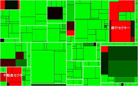 指数の割には不動産がやたらと売られているので、Nikkei225 MarketMapをチェックしてみました。