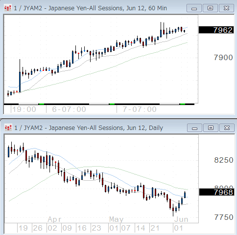 60分足では円安傾向で、日足では依然円高トレンドが継続中。