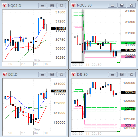 ダウ指数の日足は非常に短い陽線で、終値は1万3千300ドル台。