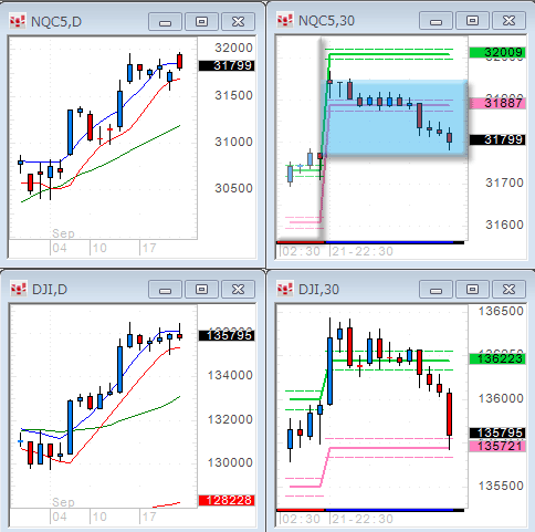 ダウ指数の日足も、下ヒゲをつけたDOJIに近い陰線で、終値は1万3千500ドル台。