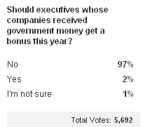 質問: 政府から救済資金を受け取った企業の幹部たちに、年末のボーナスは支払われるべきだろうか?