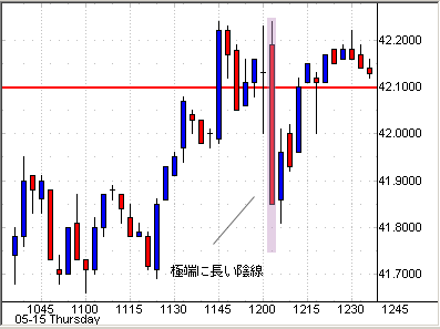 したいのは、12時直後の陰線の長さだ。あまりにも、長すぎないだろ