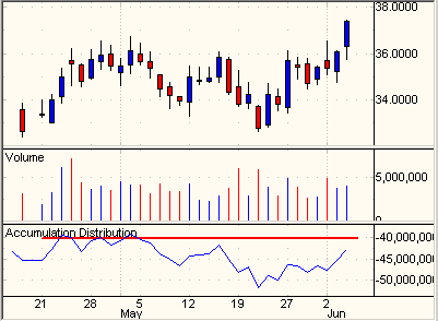 更にAccumulation Distributionを入れてみよう。これは買いの力を